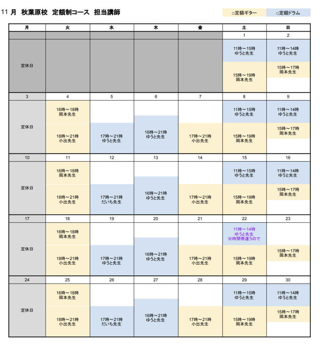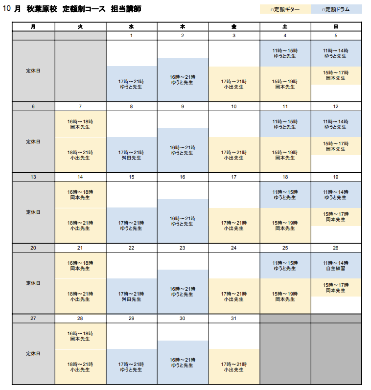 秋葉原校-定額制コース カレンダー