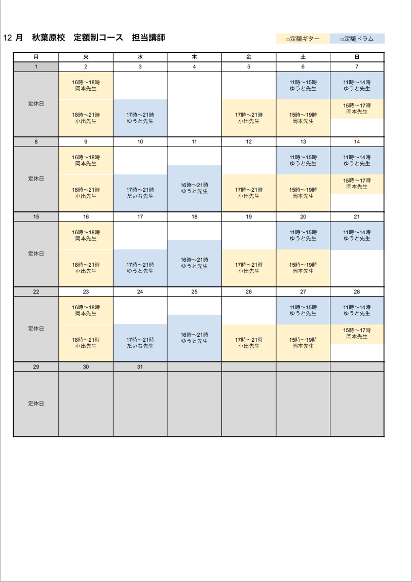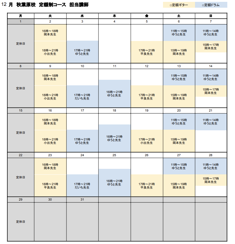 秋葉原校-定額制コース カレンダー