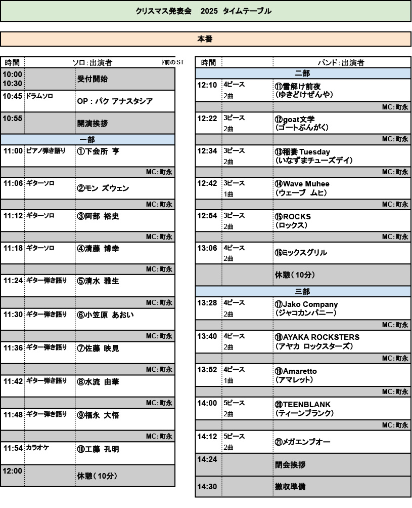 目安:セッティング 3分、演奏4分30秒×2曲