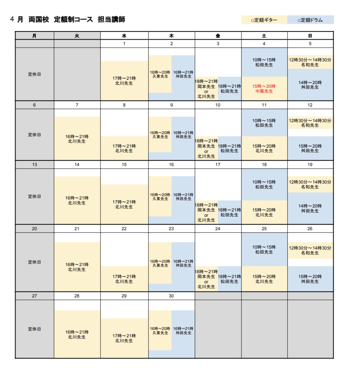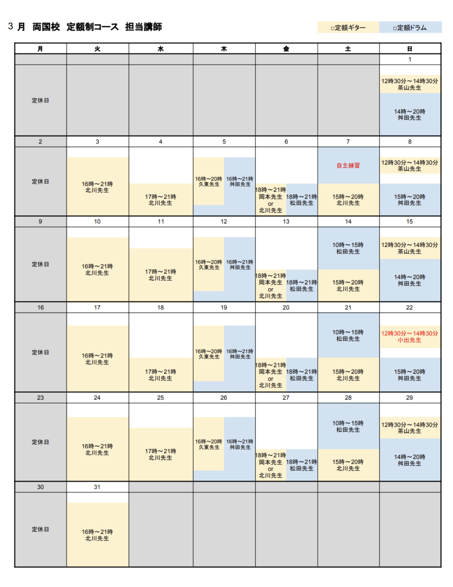 両国校-定額制コース カレンダー